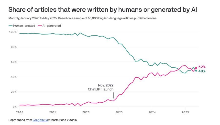 Oxford’lu araştırmacılara göre, Yapay Zekâ (YZ) içeriği, 2020’de yaklaşık %5 iken, Mayıs 2025 itibarıyla %48’e yükseldi. Tahminler, gelecek yıl bu oranın %90+’ın üzerine çıkacağını gösteriyor.